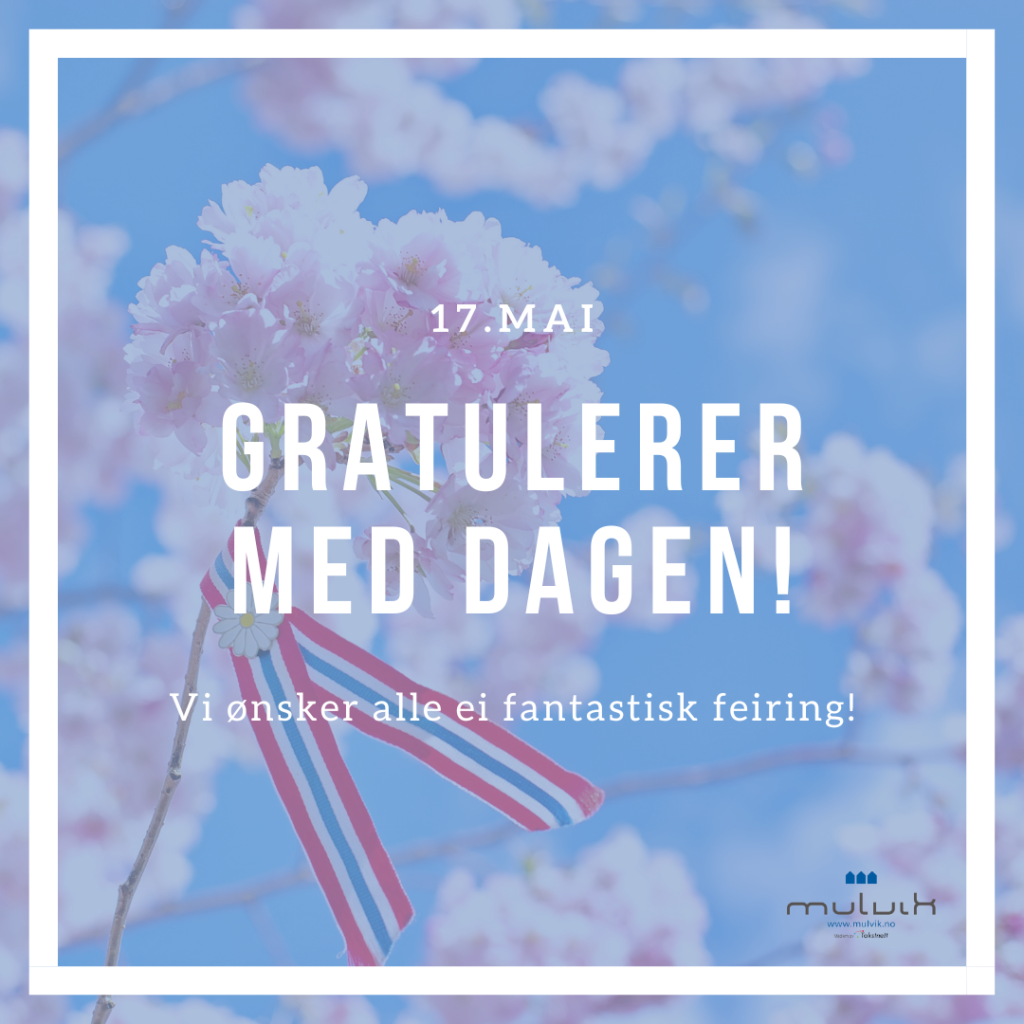 Vi i Mulvik vil gratulere så mykje med nasjonaldagen til alle saman! Vi håpar på ei riktig god feiring med mykje god mat, strålande vêr og godt selskap.