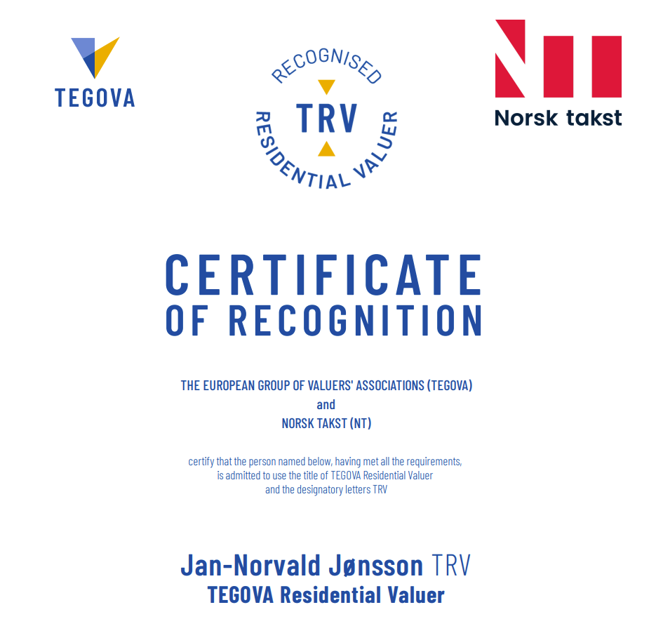 TRV-status er eit kjennetegn på utmerkelse innan verdivurdering av boligar, og demonstrerar ovanfor internasjonale og lokale kunder at takstmannen er kvalifisert til ein konsekvent høg europeisk standard.